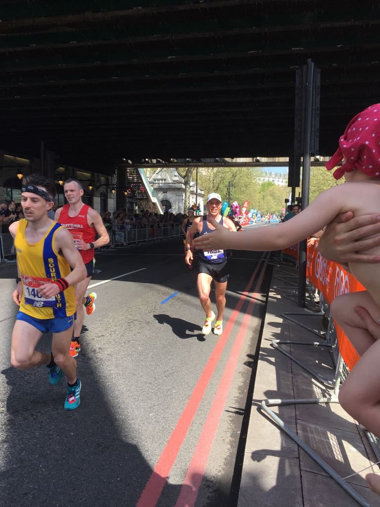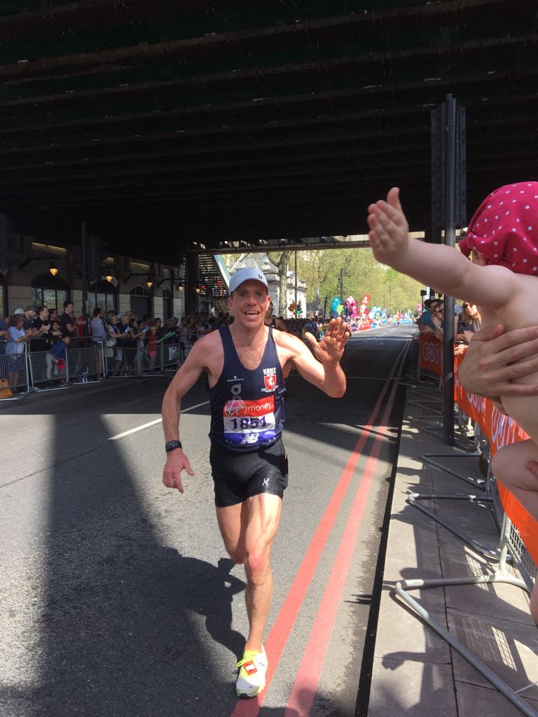 I get to mile 25 and bizarrely am feeling the best I have ever felt at this point. In 2016, I hit the wall, and 2017 I got a stitch. So I do a high-5 with Jim, my little boy, and I make sure I enjoy the last mile. Into the Mall and I kick past the group I am with and wave to the crowds, the response is fantastic and I am happy to squeeze under 2hrs30.